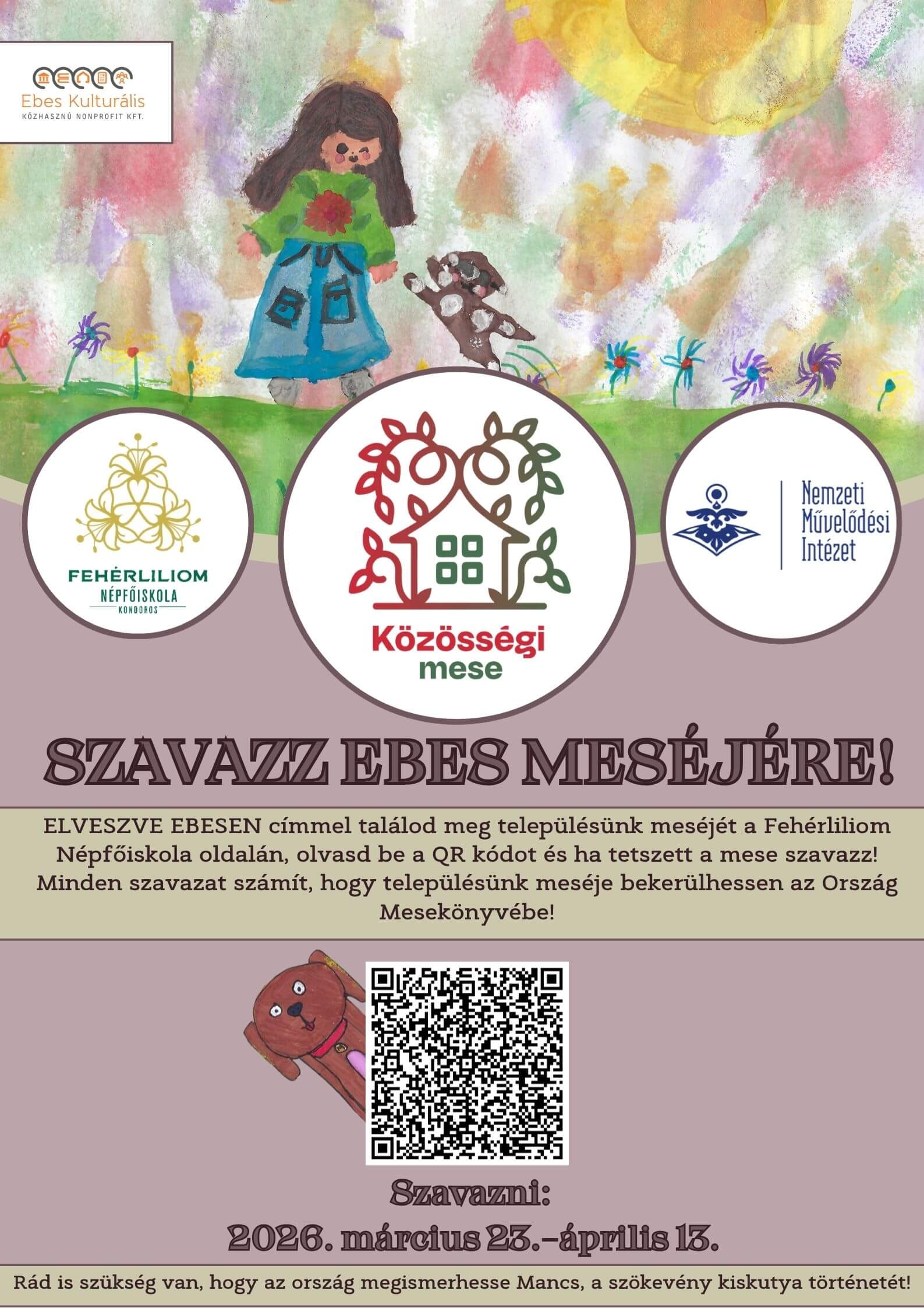 Idén településünk is csatlakozott ehhez és megszületett mesénk, Elveszve Ebesen címmel, mely a lenti linkre kattintva vagy a QR kód beolvasásával érhető el a Fehérliliom Népfőiskola honlapján.